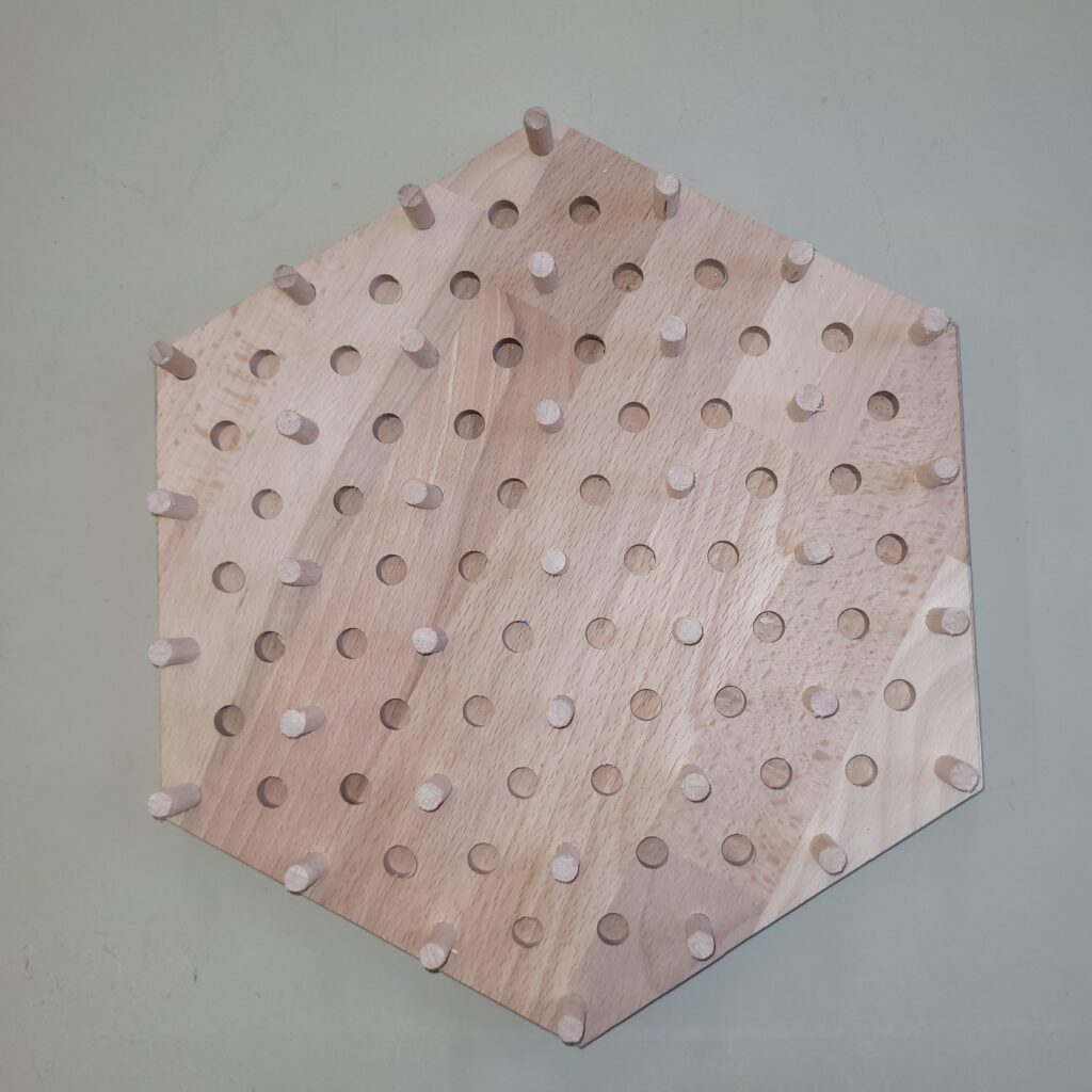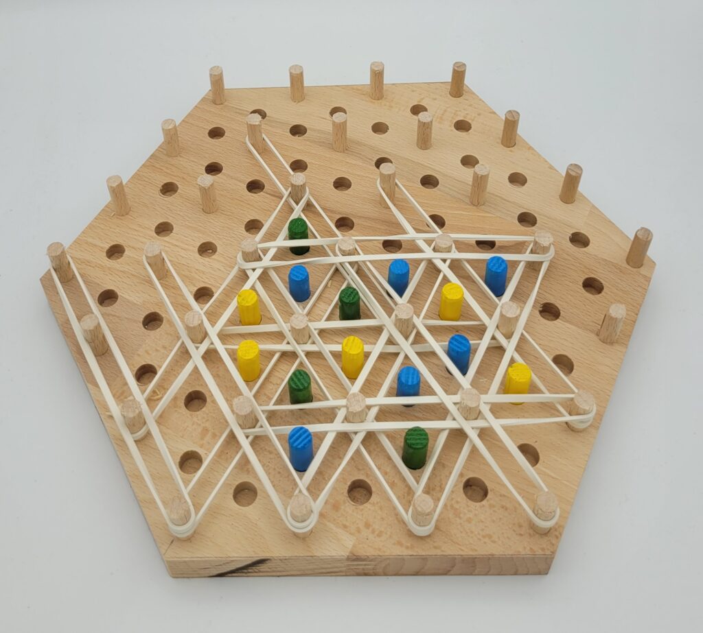 Die Teilnehmer:innen bauten ein Spiel aus Holz. Ziel des Spiels ist es, möglichst viele Spielsteine auf dem Spielfeld zu platzieren. Die Spieler*innen dürfen nacheinander in jedem Zug ein Gummiband um genau 4 feste Stäbe parallel zu den Kanten spannen. Wird ein Dreieck komplett von Gummibändern umschlossen, darf ein Spielstein in das Dreieck gesetzt werden.