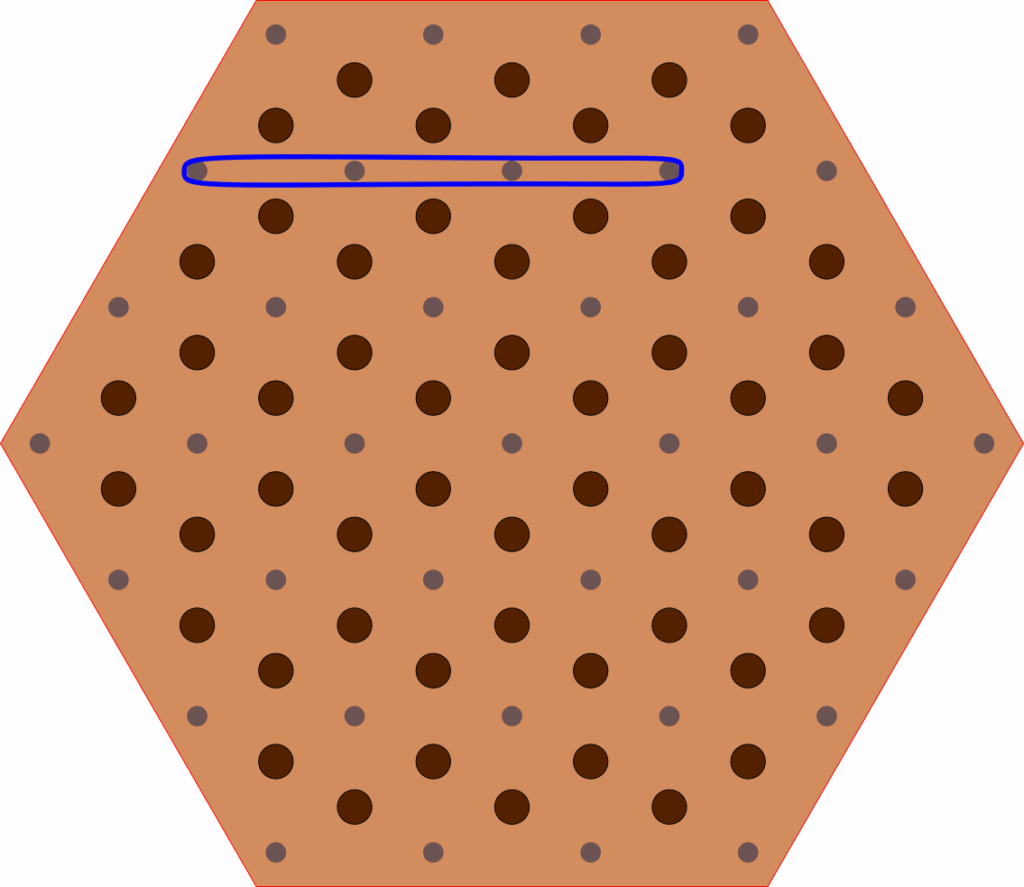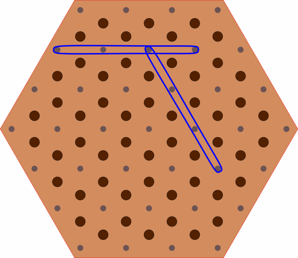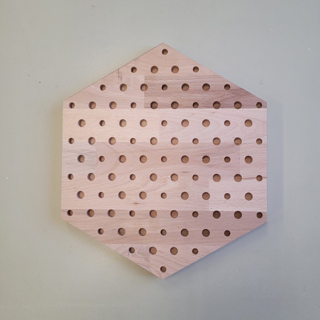 Aus der Multiplexplatte sollte in der Vorbereitung mit einer Kreissäge ein regelmäßiges Sechseck mit Kantenlänge 15cm gesägt werden. Hierzu eignet sich z.B. eine Handkreissäge oder Tauchkreissäge mit Führungschiene. Anschließend werden die Löcher gebohrt. Die Löcher für die dünnen Stäbe können hierbei ca 0.05mm kleiner und die Löcher die dicken Stäbe ca 0.1mm größer sein. Dies kann z.B. entweder mit einer CNC-Fräse erledigt werden, falls vorhanden, oder mit einer Bohrmaschine. Die Löcher sollten möglichst senkrecht gebohrt werden. Die Tiefe der Löcher sollte ca. 8mm sein. Eine CAD-Zeichnung findet sich unten.