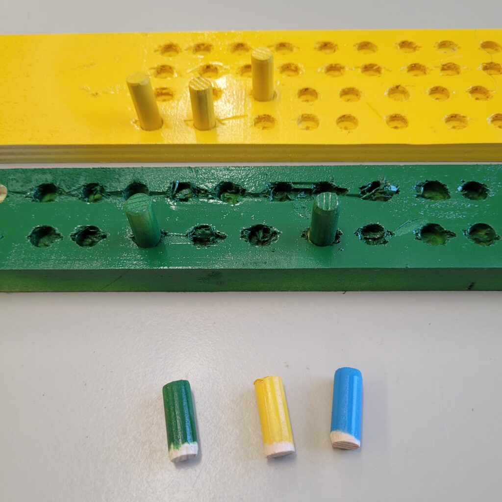 Vom Buchenrundstab müssen nun 37 Stücke á 30mm abgesägt werden. Vom dickeren Fichtenrundstab ungefähr 60 Stück á 25mm. Die genaue Anzahl hängt hier von der gewünschten maximalen Spieler*innenanzahl und den Spielsteinen pro Spieler*in ab. Hier haben wir uns für 3 Spieler*innen mit 20 Steinen entschieden. Wir empfehlen die Stäbe mit den Kindern an einer Bandsäge mit Anschlagsmöglichkeiten zu sägen. Das Sägen von Hand wäre wahrscheinlich zu zeitaufwändig und anstrengend für Kinder.